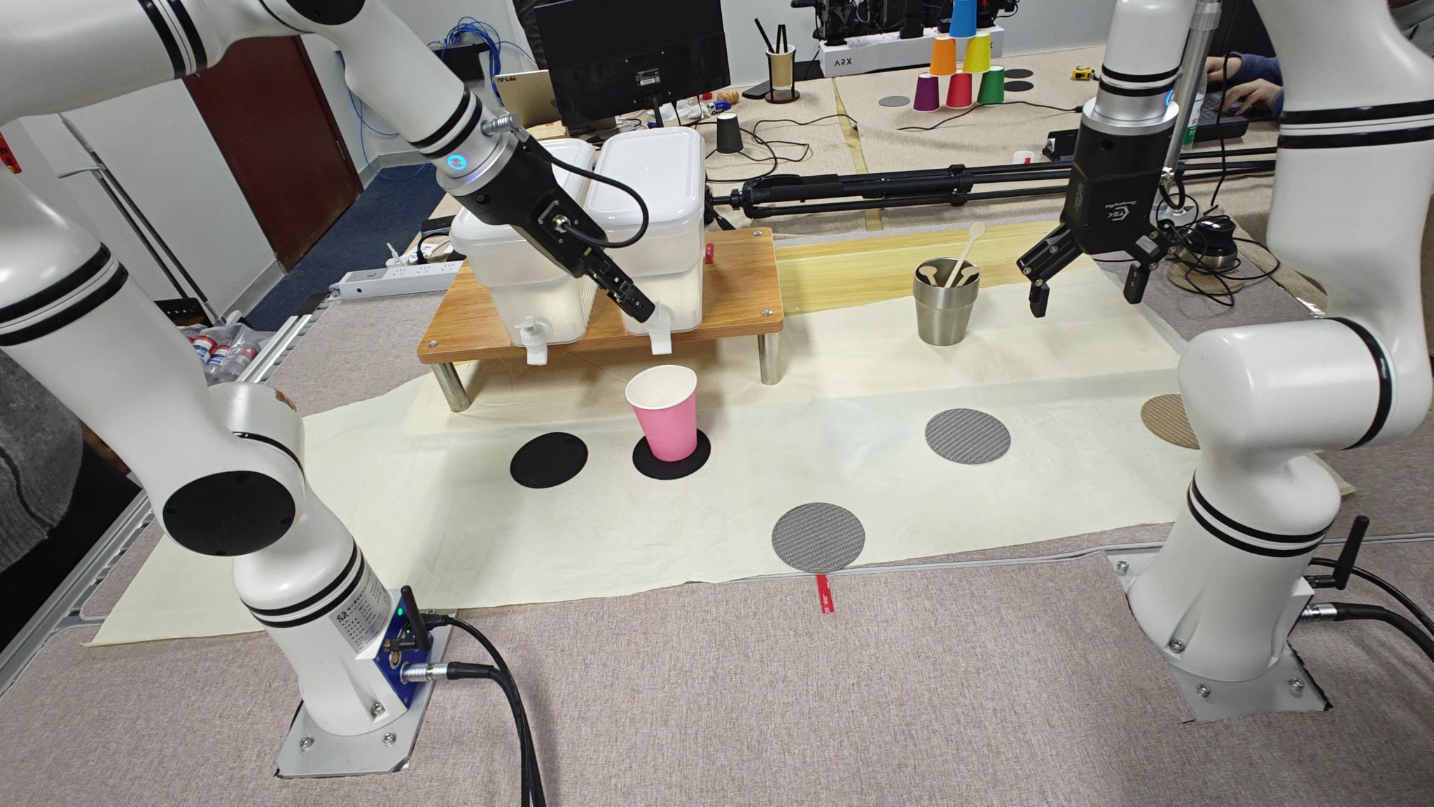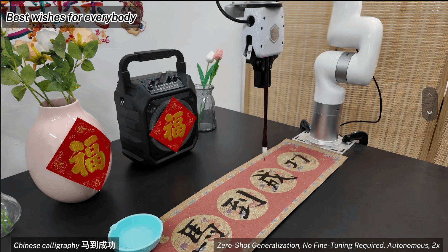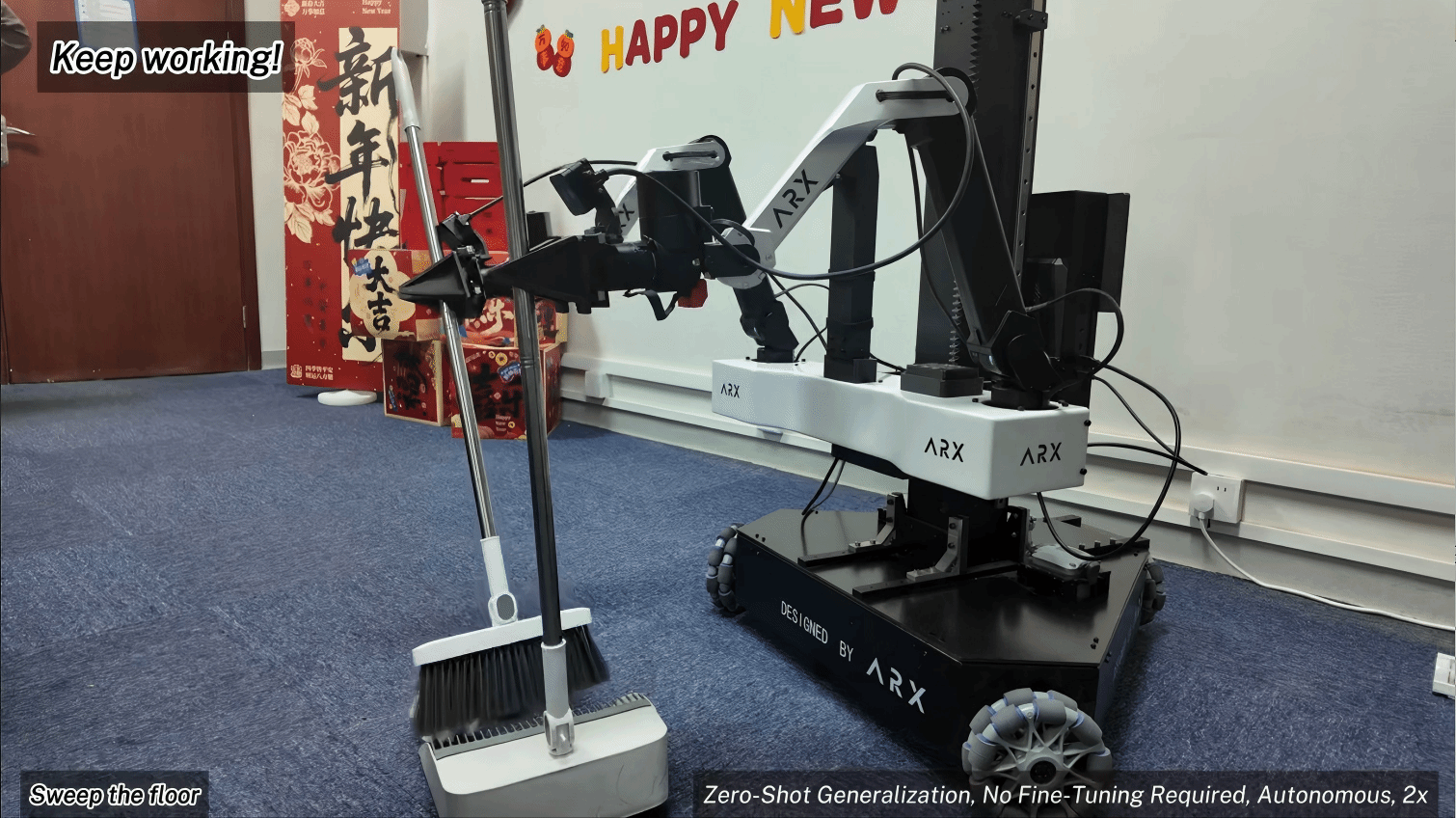 走进深度强化进修尝试室,记者看到这里特地安插成了一个“春节居家现场”:尝试台上摆着小摆件,贴着对联,浓浓的年味里,一群年轻人正围正在几个机械人跟前忙活着。尝试室青年汤宏垚副研究员、马亿副传授、郑岩副传授正正在现场指点团队调试系统、验证使命结果。再给客人做杯奶茶。”话音刚落,机械人便起头步履起来。它先识别出地上“需要清理的垃圾”,随后机械臂精准地抓起扫帚,沿着规划好的径完成清扫;做奶茶时,机械臂悄悄捏起客人喜好的纸杯,进行奶茶制做,完成加茶、加奶、搅拌等一系列精细操做,最初稳稳端到客人跟前。整个过程趁热打铁,不需要报酬干涉。