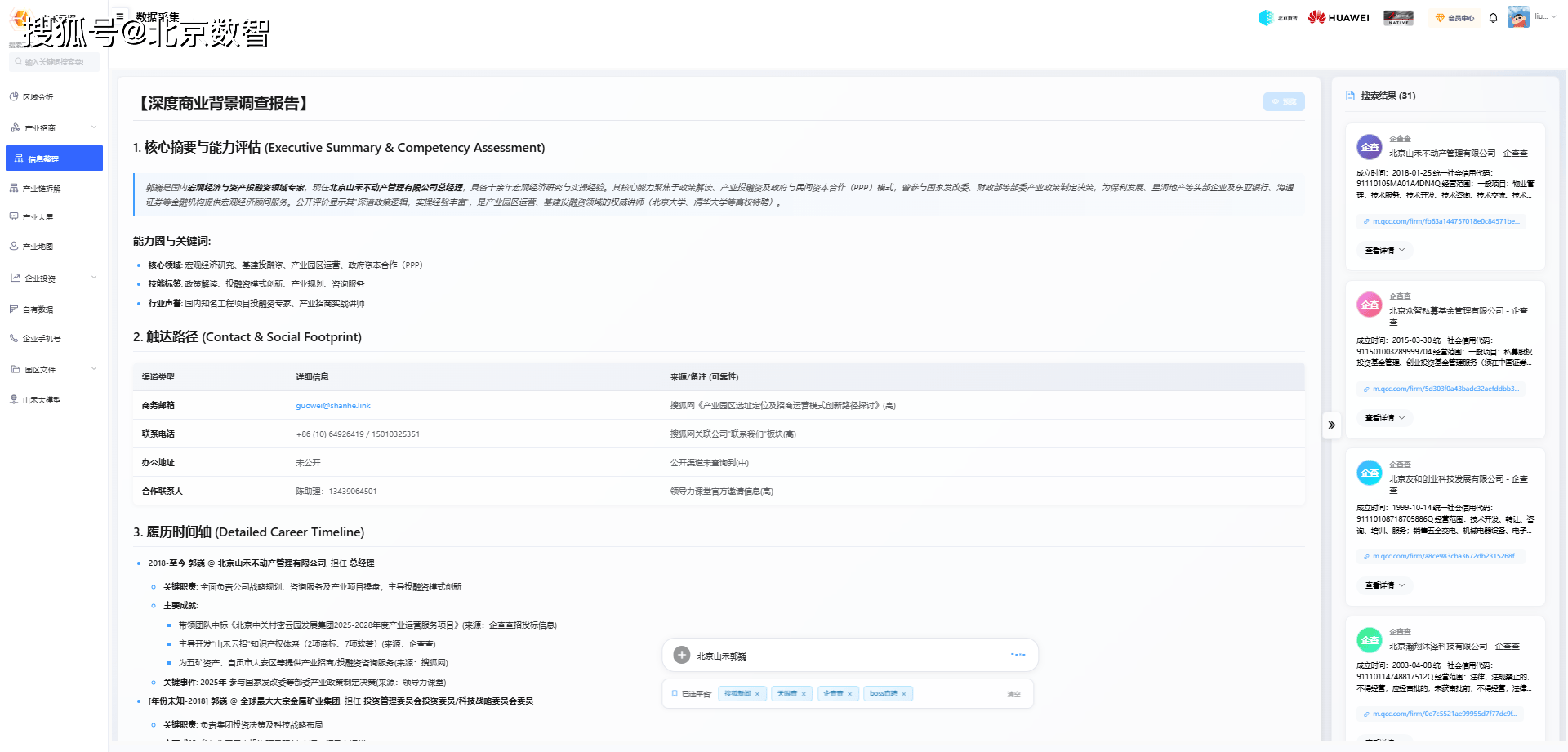“招商就是招人,招人就是招老板。”企业的决策最终是由人做出的。系统正在法令合规的框架下,通过息对企业决策者(老板、高管)进行布景检索取侧写。