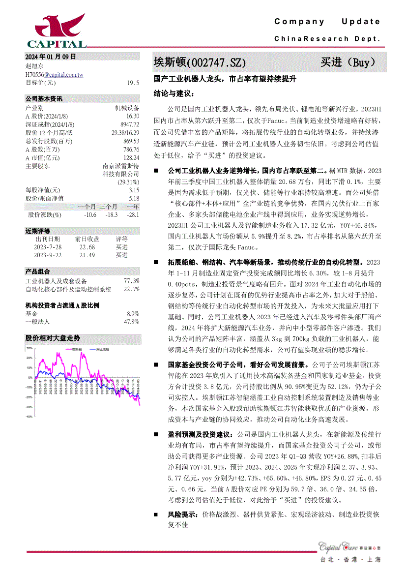 C o m p a n y U p d a t e C h i n a R e s e a r c h D e p t 。 阿2024年01月09日赵旭东方针价(元) 19。5 公司根基资讯财产别机械设备A股价(2024/1/8) 16。30 深证成指(2024/1/8) 8947。72 股价12个月高/低29。38/16。29 总刊行股数(百万) 869。53 A股数(百万) 786。76 A市值(亿元) 128。24 次要股东南京派雷斯特科技无限公司(29。31%) 每股净值(元) 3。15 股价/账面净值5。18 一个月三个月一年股价涨跌(%) -10。6 -18。3 -28。1 近期评等出刊日期2023-7-28 2023-9-22 前日收盘22。68 21。49 评等买进买进产物组合工业机械人及成套设备77。3% 从动化焦点部件及活动节制系统22。7% 机构投资者占畅通A股比例基金8。9% 一般法人47。8% 股价相对大盘走势埃斯顿(002747。SZ)买进(Buy) 国产工业机械人龙头,市占率无望持续提拔结论取:公司是国内工业机械人龙头,领先结构光伏、锂电池等新兴行业,2023H1国内市占率从第六跃升至第二。
