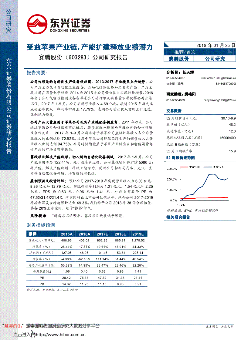 投资高企把握3G投资从题公司研究东兴证券股份无限公司证券研究演讲受益苹果财产链,产能扩建业绩潜力——赛腾股份(603283)公司研究演讲 2018年01月25日保举/初次 赛腾股份公司研究演讲摘要:公司为领先的从动化出产设备供应商,2013-2017年业绩呈上升趋向。